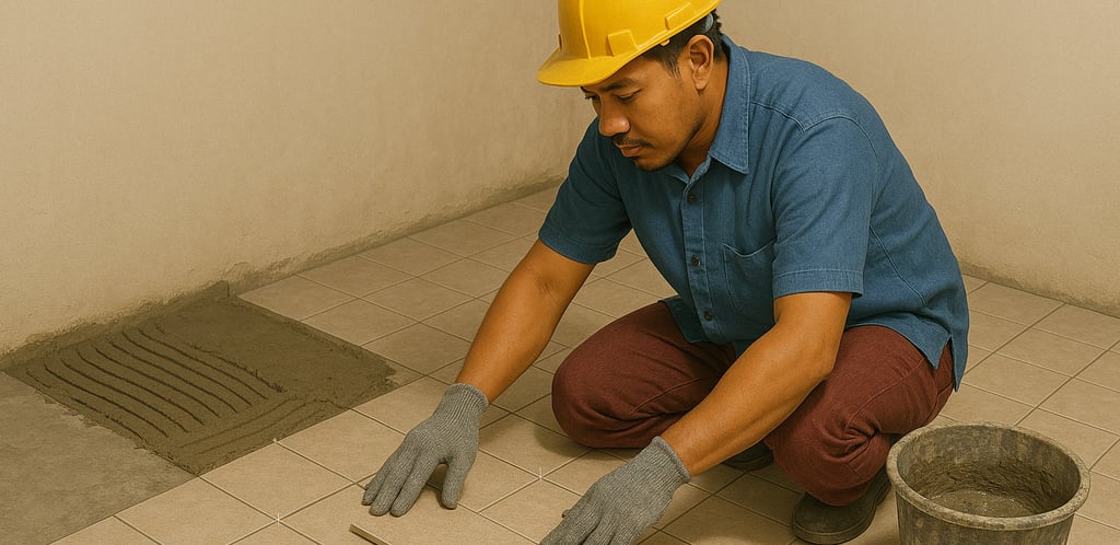 Sebelum keramik diletakkan, lem khusus untuk keramik akan dioleskan secara merata di permukaan lantai menggunakan trowel. Selanjutnya, keramik akan ditekan secara perlahan untuk memastikan semua bagian terikat dengan baik. Proses ini membutuhkan kehati-hatian, karena keramik yang terpasang harus berada dalam posisi yang tepat. Setelah semua keramik terpasang, tahap selanjutnya adalah pemasangan nat di antara keramik agar tampilan lebih bersih dan estetis.
